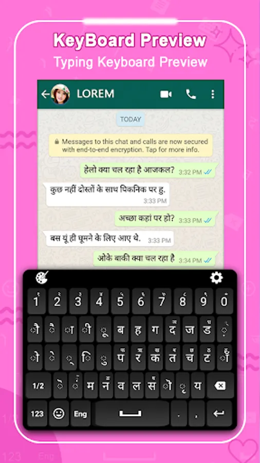 Do you find it difficult to type messages in Hindi & English while texting on your cell? Install this Hindi language keyboard, It has both Hindi & English keyboard with a variety of beautiful themes which can be changed directly from the keyboard.