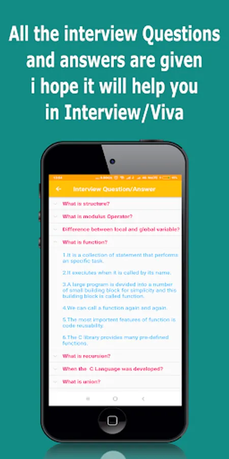 This is the only app in which you can learn the whole syllabus of C language with Tutorials ,programs and Interview questions and answers.
