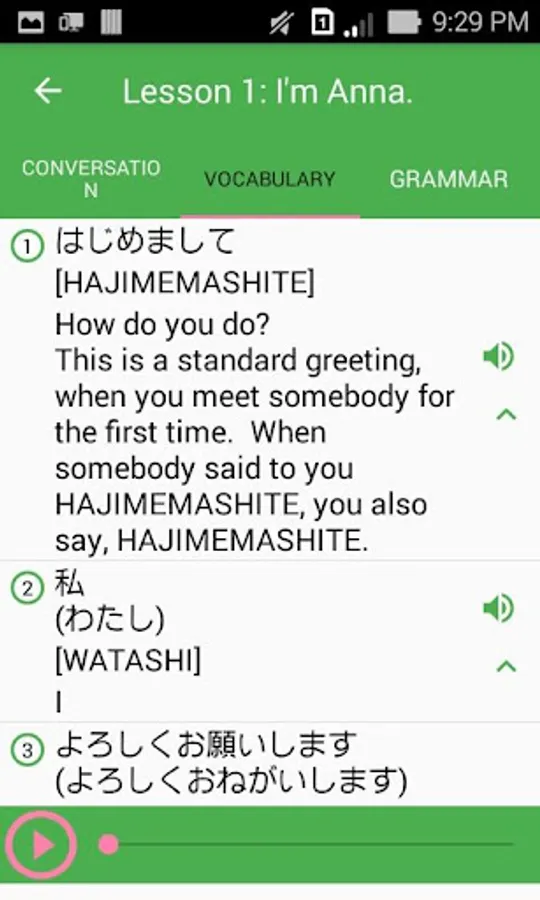 - Learn Japanese new words in each lesson. Each lesson have about 5 - 15 vocabulary with the explanation. This will help you to learn vocabulary easier.