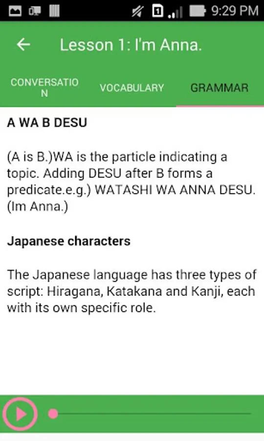 - Learn Japanese grammar. Each lesson have some grammar points.