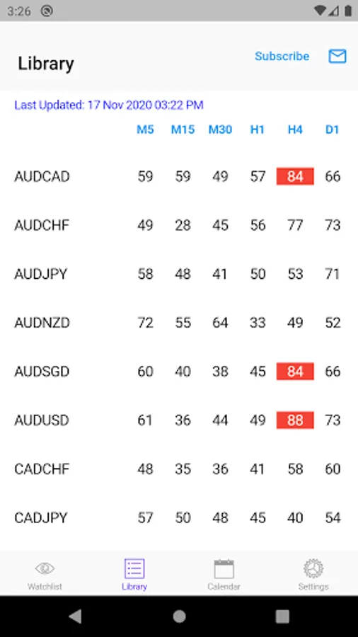 - Timely display of MFI values on multiple instruments (Forex, Commodities and Cryptocurrencies) across 6 timeframes (M5, M15, and M30 are only available for subscribers on the watch list),