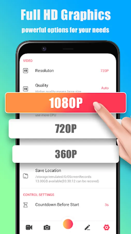 *Custom recording video quality.You can set different video resolutions, video quality, frame rates, also automatically choose the best video settings for your device.