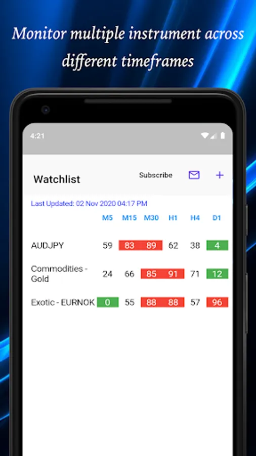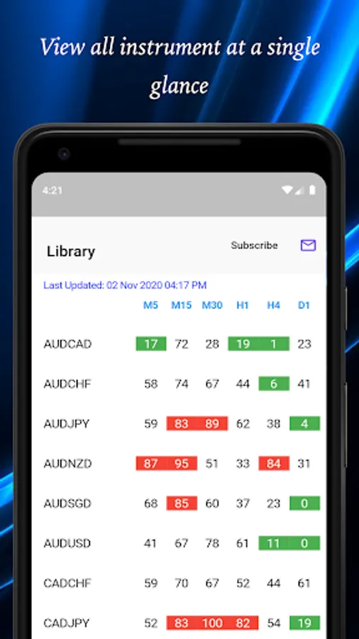 Easy StochRSI provides a comprehensive dashboard that allows you to view the StochRSI value of multiple instruments across 6 timeframes (M5, M15, M30, H1, H4, D1) at one glance. This provides you with an understanding of the current trend of the forex market on the go.