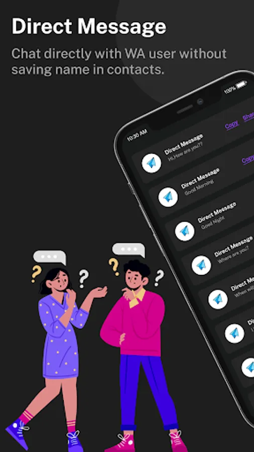 - Direct chat: chat directly with WhatsApp user without saving name in contacts.