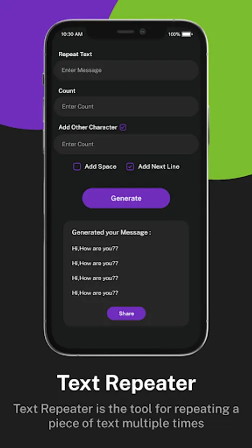 - Text repeater: repeat text message to multiple rows in second and share with WhatsApp.