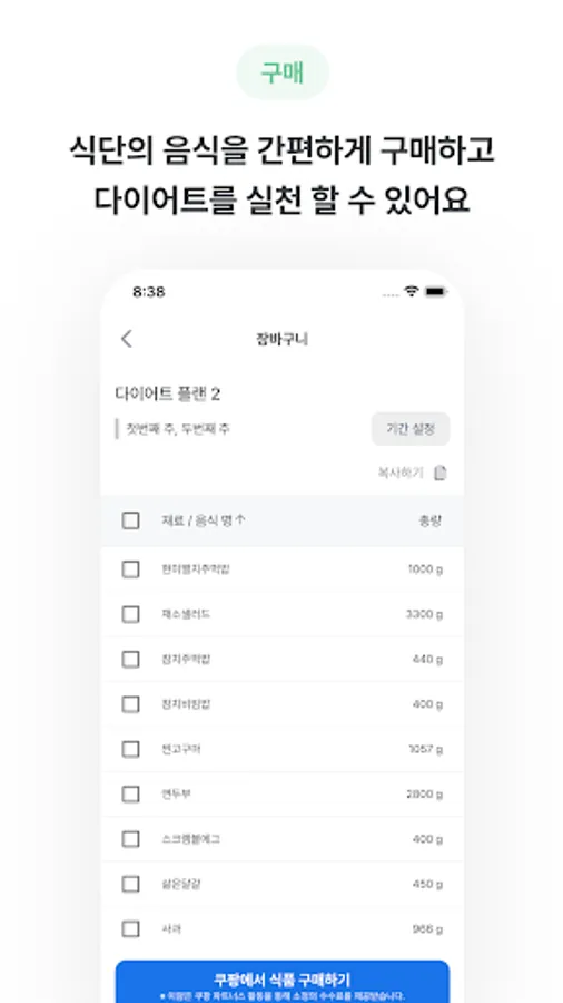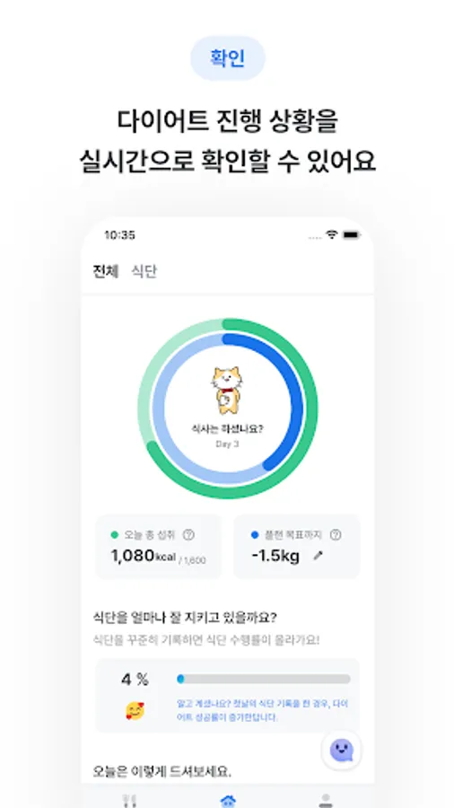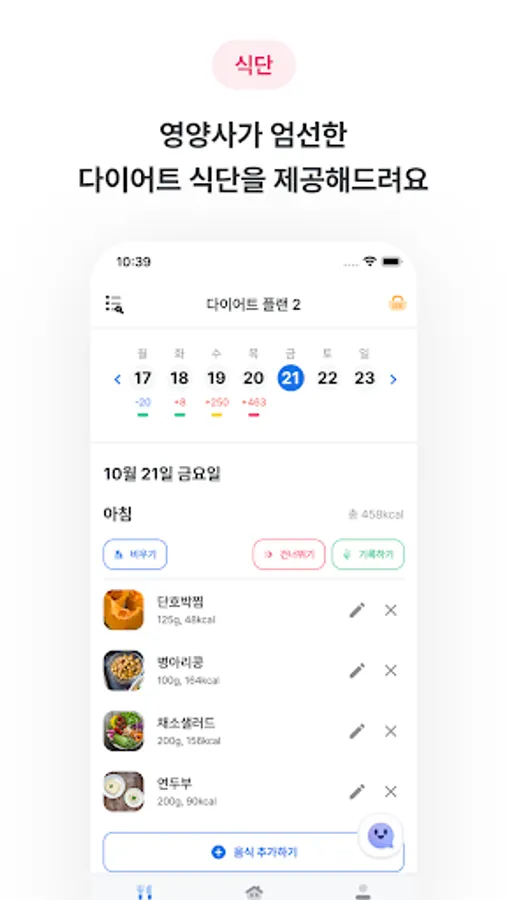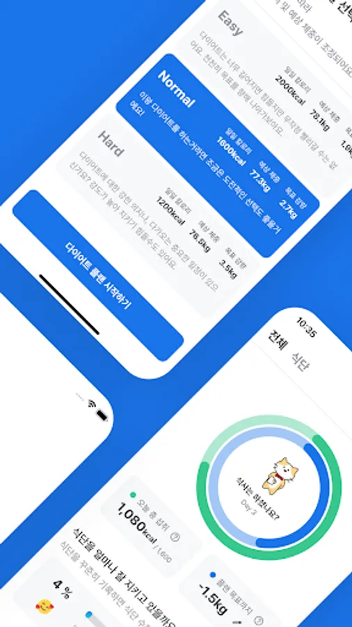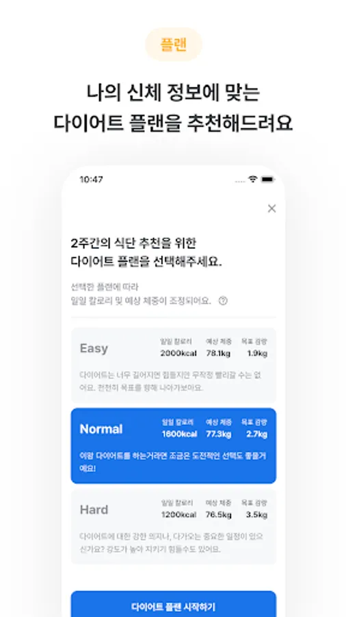 If you enter basic information such as your height, weight, and daily activity level, a '2 week' diet plan that suits you is set up. The diet plan has EASY, NORMAL, and HARD stages, so you can choose a plan depending on how fast you want to lose weight.