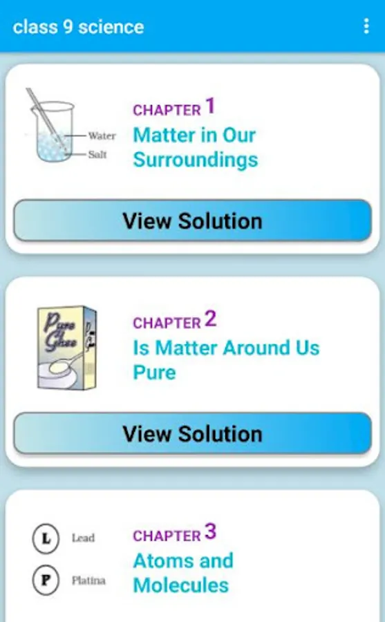 class 9 science all chapter exercise solutions are provided using this app. This class 9th science solution is very comprehensive and easy to use. Every question answer for every chapter exercises are available - all in offline.