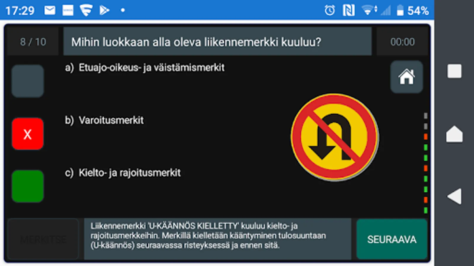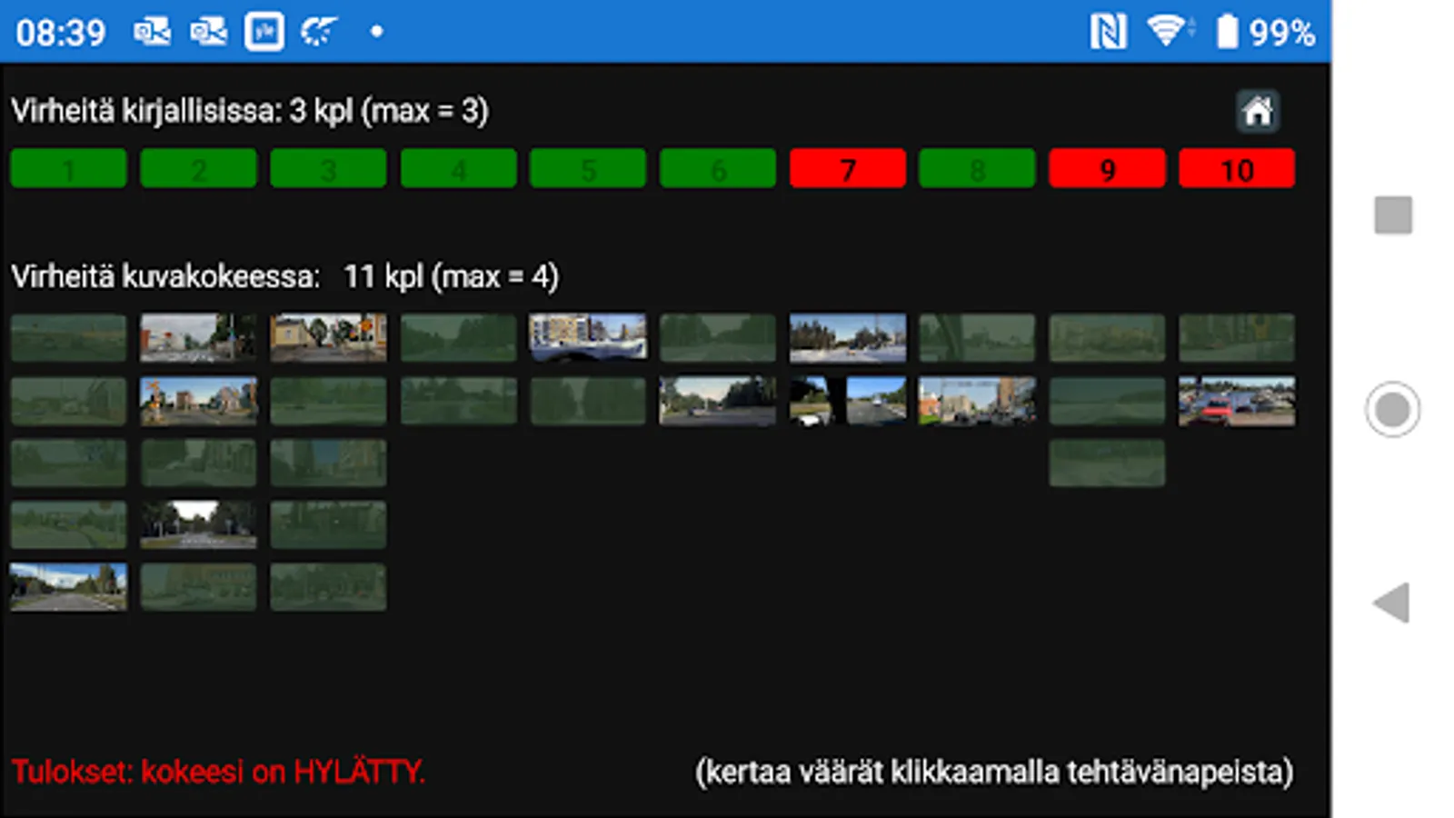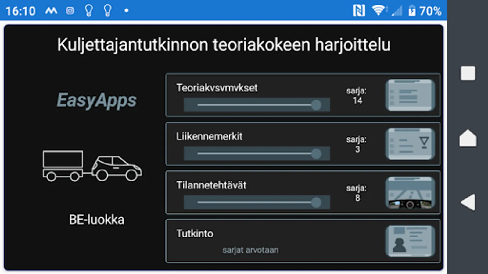 You can only practice the sets of the theory test, traffic signs and image test at first. In the internship phase, you will see your skills in the LED bar, a picture of the circles and feedback text.
