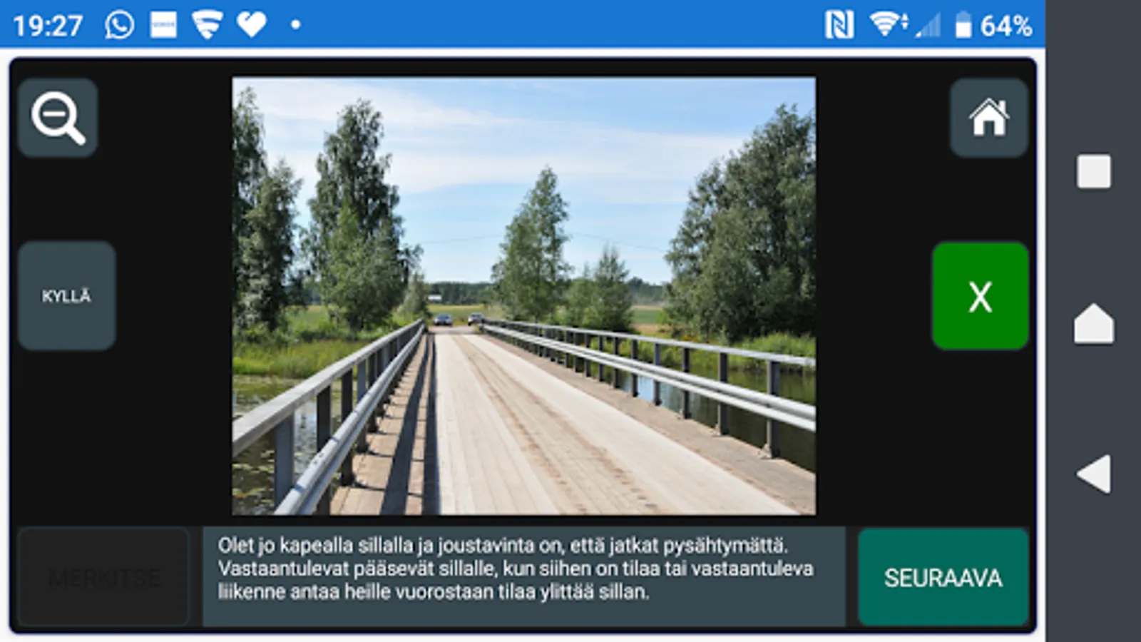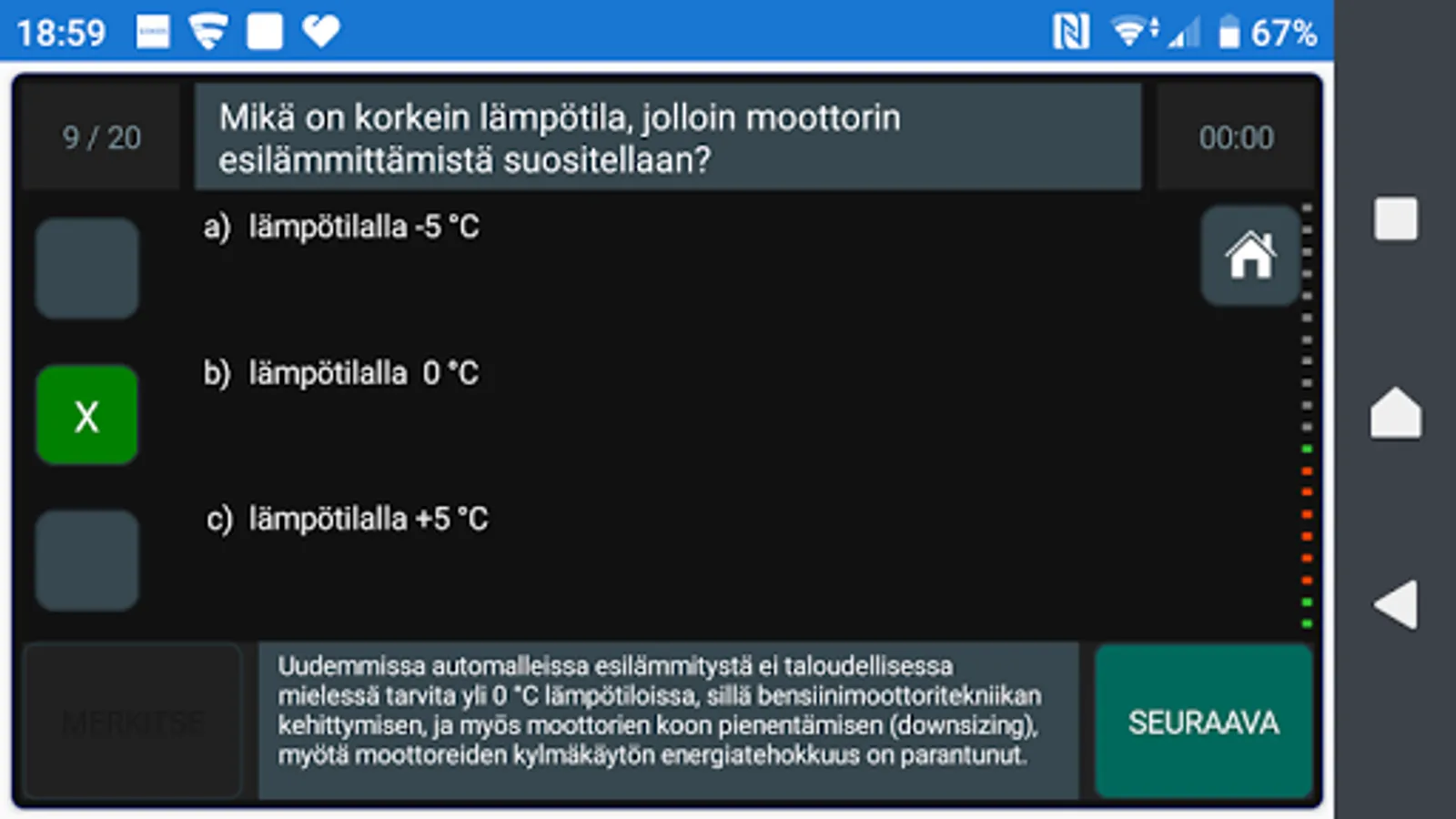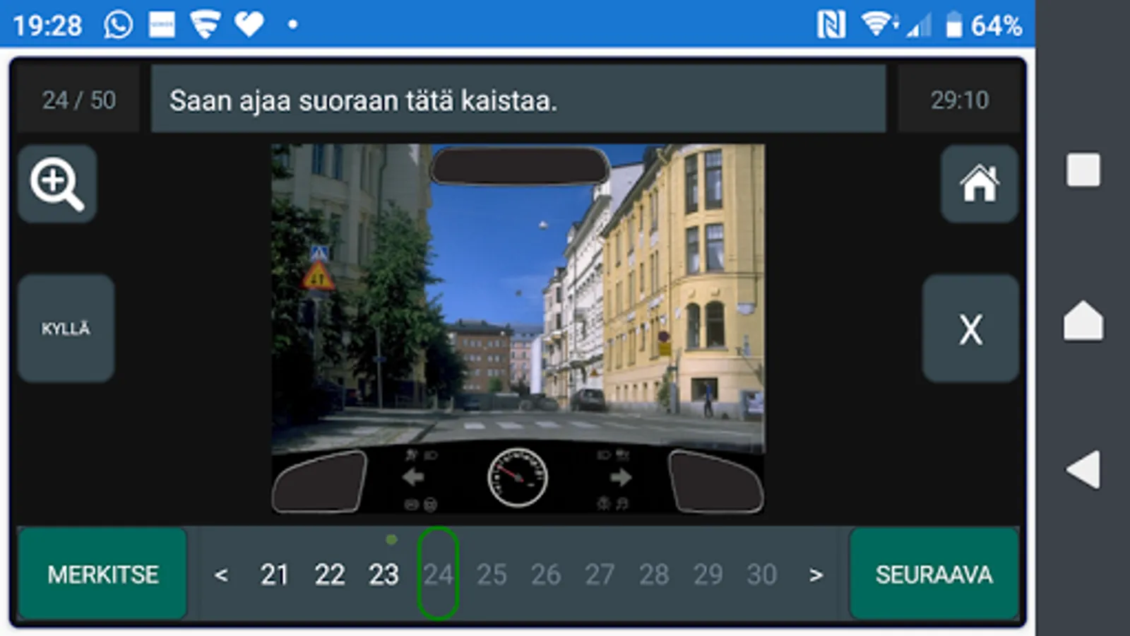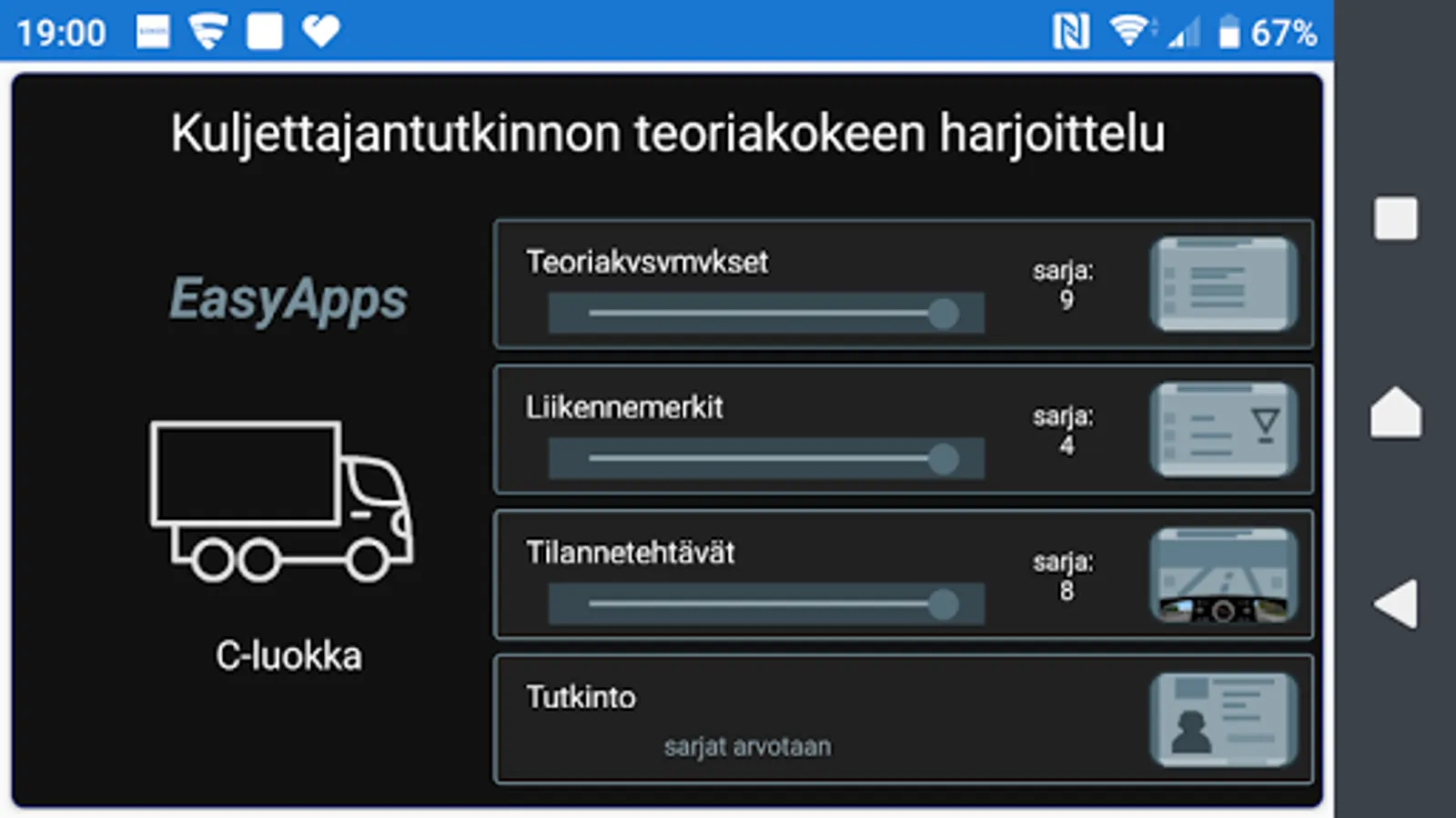 At first, you can only practice the series of theory test, traffic signs and picture test. During the training phase, you can see your skills on the LED bar, the circles in the image and the feedback text.