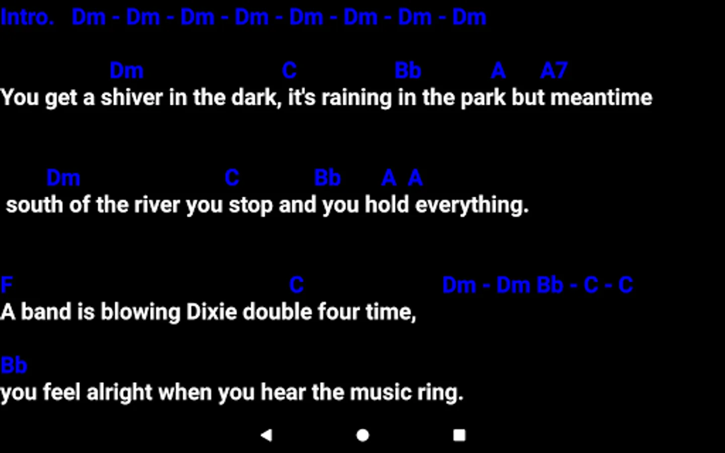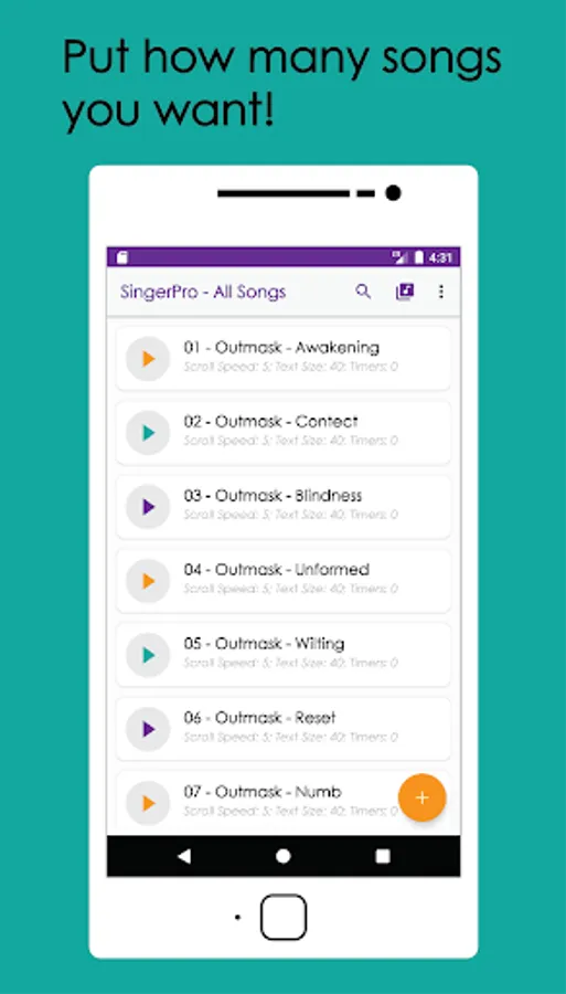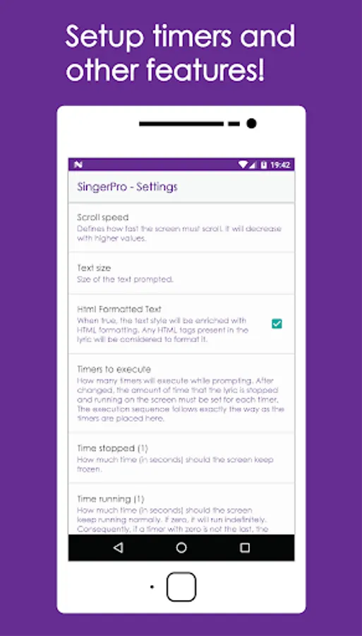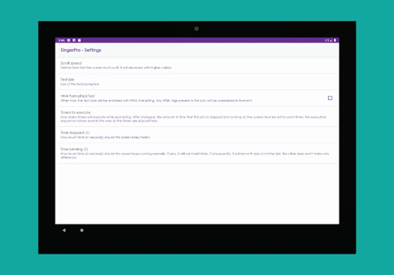 It provides timers that allow you to sing and play an instrument at the same time. This is possible because you can configure each point that you stop singing and a guitar solo comes in, for example. At these specific times the screen freezes and after another setup timer the animation resumes from the last point, giving you complete control over every song without any interaction with the device during the performance.