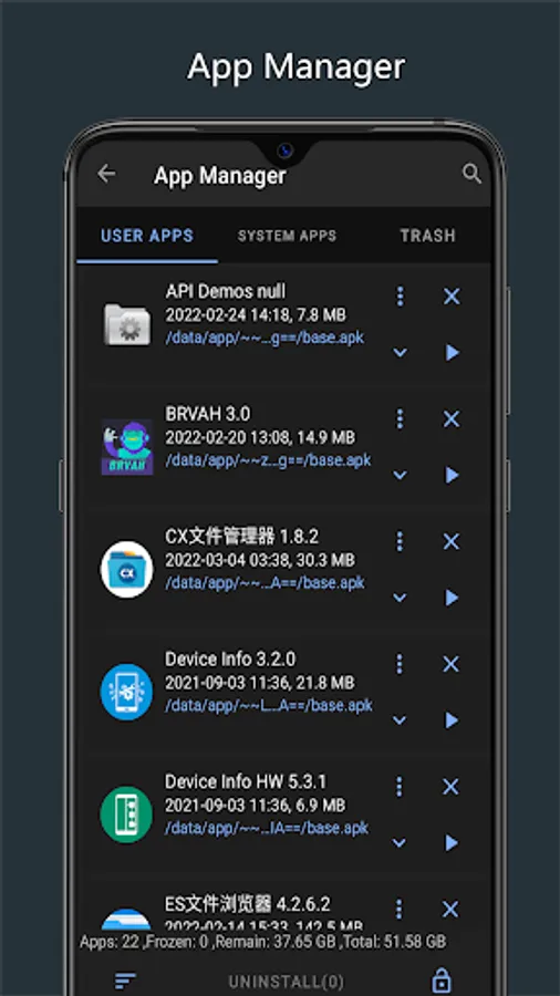 - Display user apps, system apps and trash;