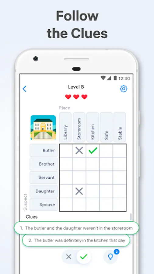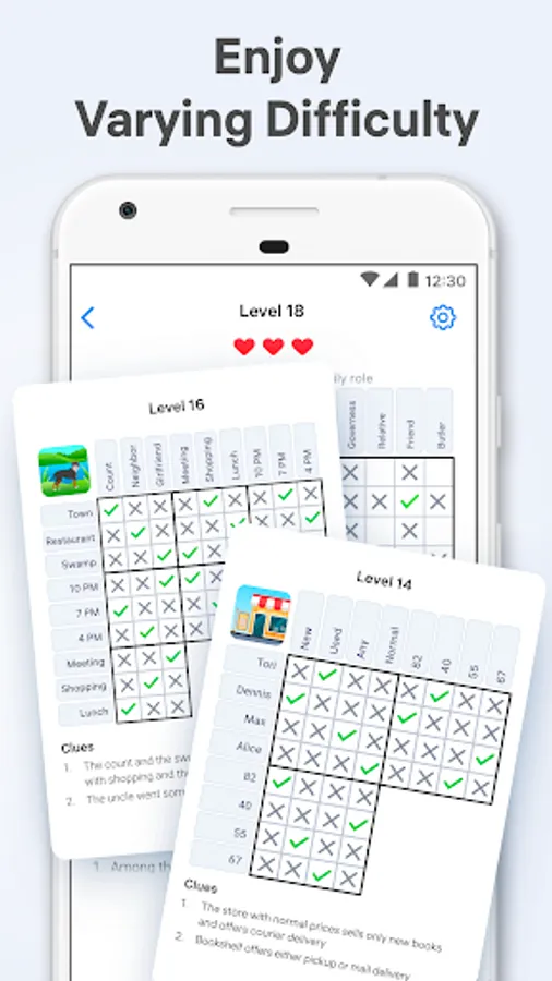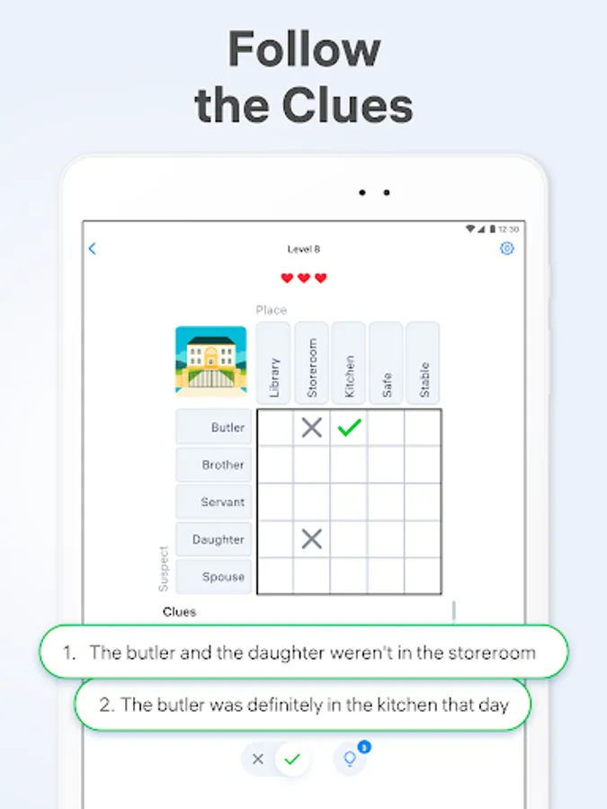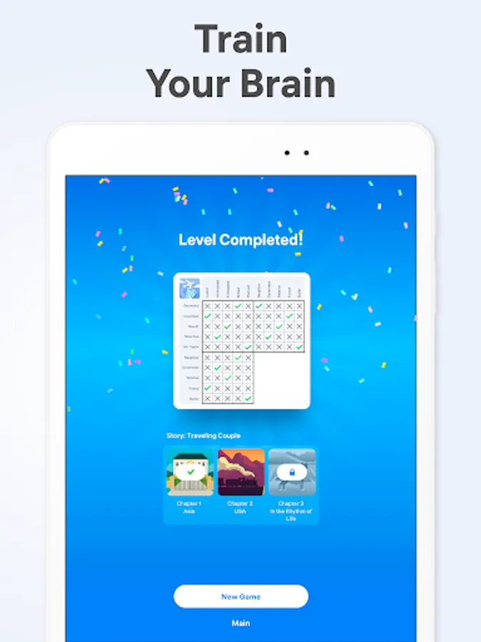 This fun yet challenging brain puzzle game with simple rules may help to strengthen logical thinking and deductive reasoning. Try to solve all the smart riddles grouped into thematic stories that are sure to delight in this one of the most exciting brain games. Help Detective Grapes investigate a necklace theft, participate in vacation planning for a young couple, or even go on a space expedition. You will find many mind-bending stories with varied plots and tricky solutions. If you are interested in solving logic problems, play this engaging brain game and have hours of fun!