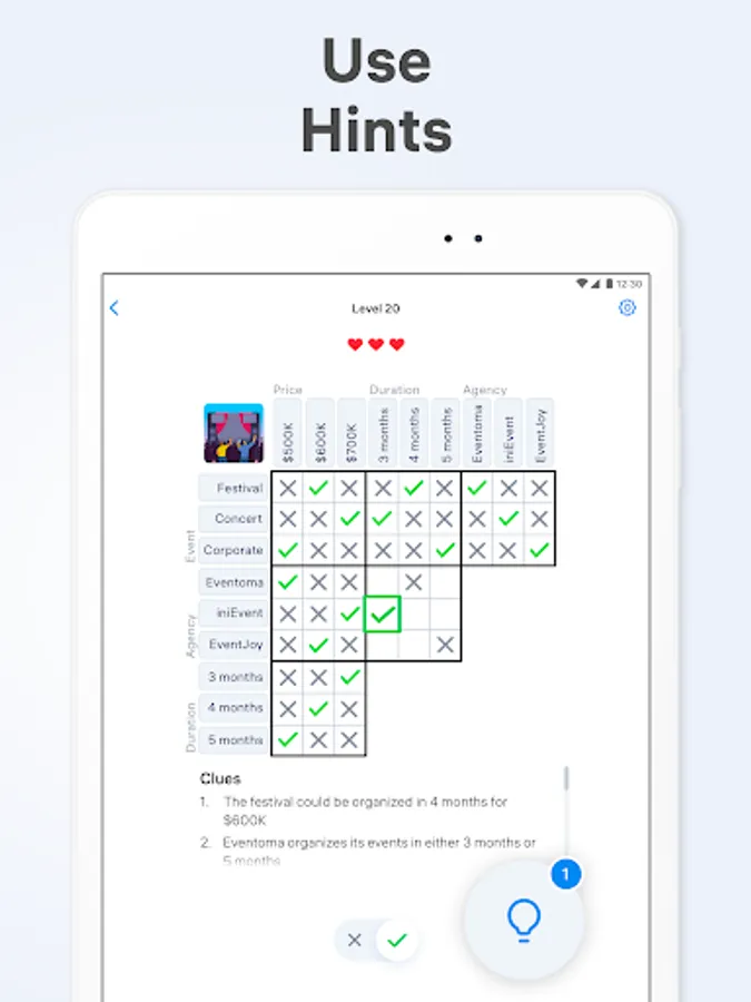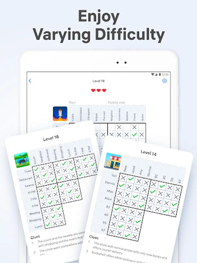 • No time limit, take your time and focus on the details playing cross logic riddles