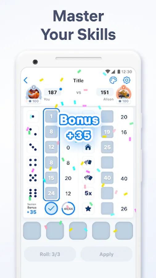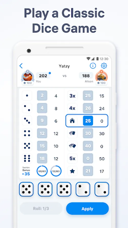 Start rolling dice, test your luck and strategic skills and enjoy playing free Yatzy Match anywhere, anytime!
