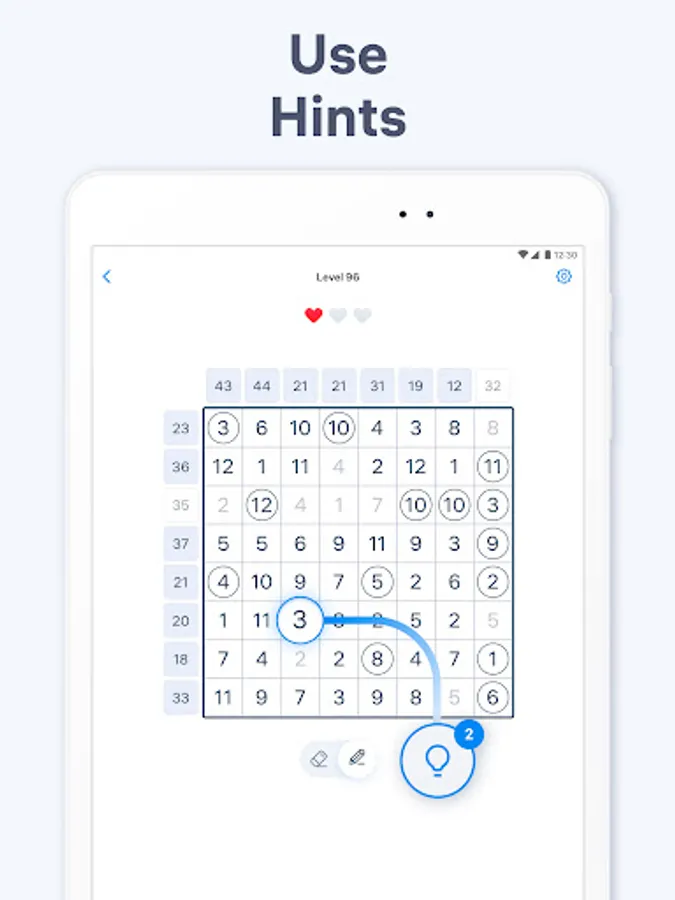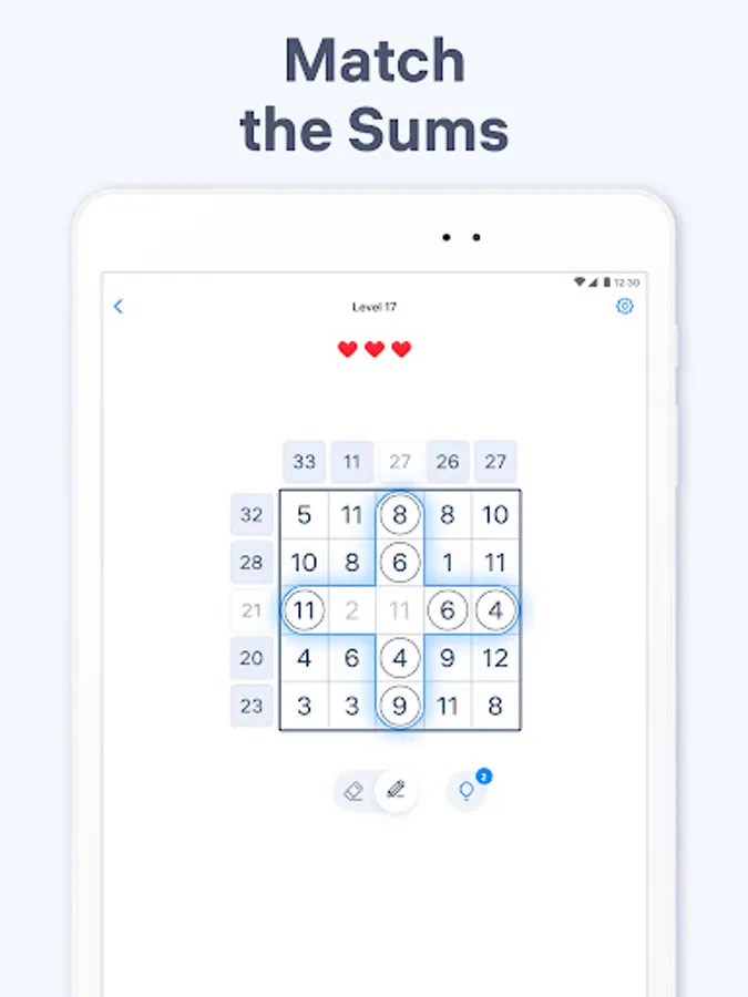 Each row and column has its own solution, but the goal of this math game is to make them all work at the same time. You have to circle correct numbers and erase numbers you don't need. Remember, the sums of numbers in rows and columns should be equal to the numbers on the side of the board. Each level of this numbers game has only one solution, try to find it to solve challenging mind puzzles!