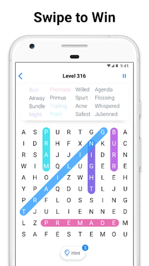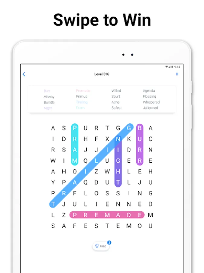 * Search and swipe letters to create words horizontally, vertically or diagonally.