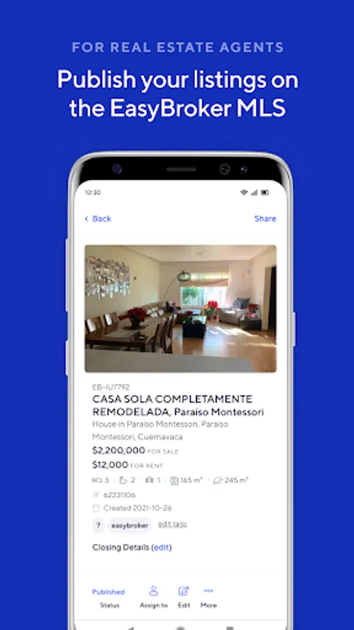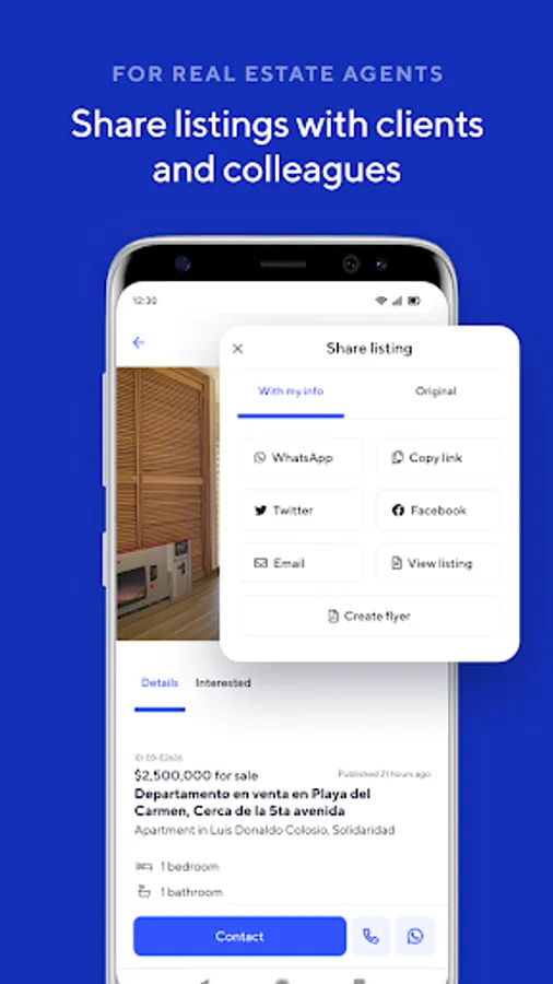 And as a real estate agent you can publish and create flyers of your listings or your colleagues’ and share them with your clients by email, WhatsApp, from your phone or tablet.