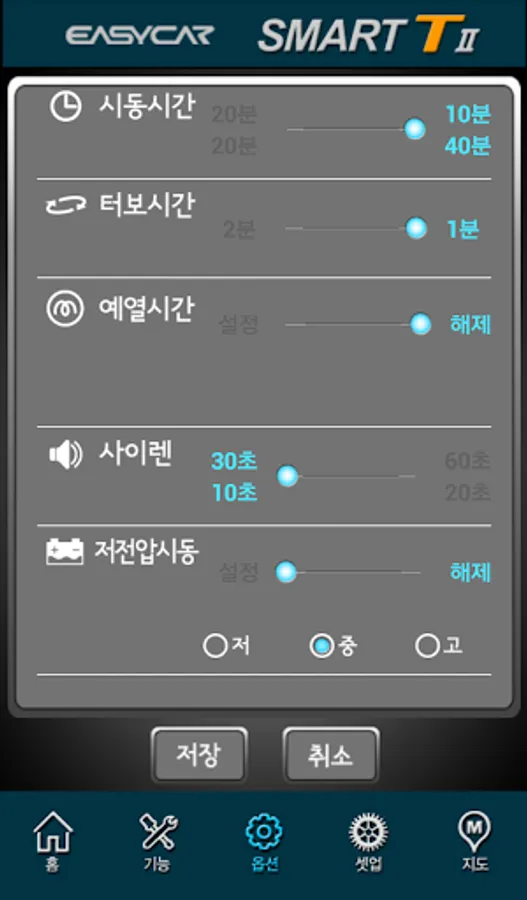- Start-up time, turbo time, siren, warm-up time and low voltage start-up setting adjustment