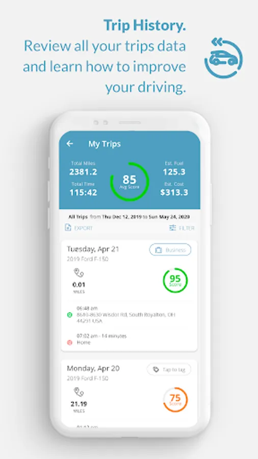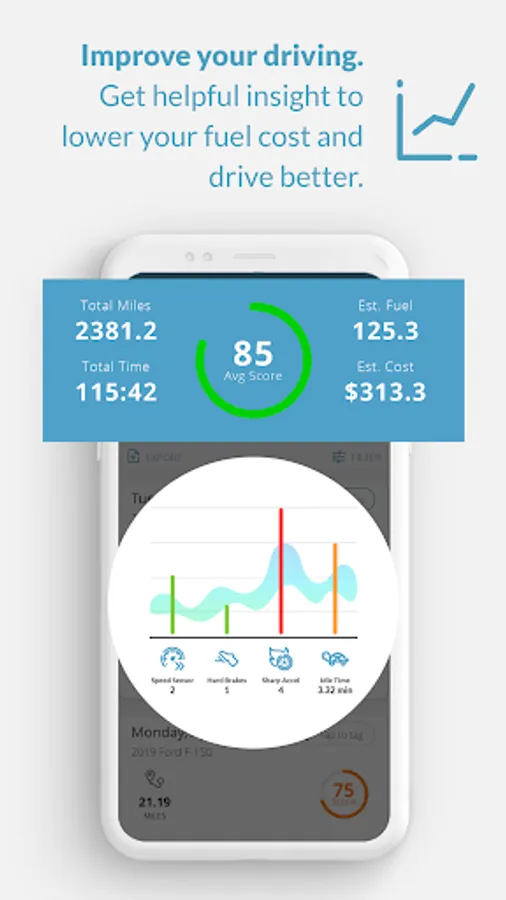 * Track your driving habits, rate your driving performance and receive helpful insight on fuel efficiency and safety