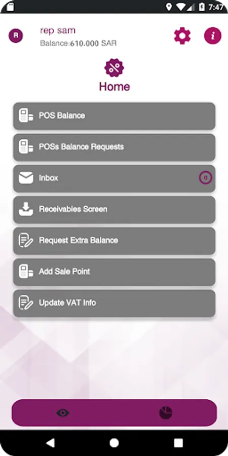 in this level you can add POS and control these devices and get report from there process or purchases . send credit , POS report , check balance , add new device , ask for new credit.