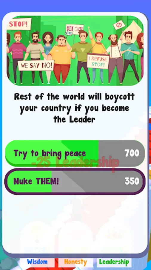 You are a student with big dreams, you want to be a president one day. Climb the arduous stairs of life, answer questions, make decisions, and try to reach your goal, and become the president! You will get old, slow down, and fall back, but don’t let it tire you out! Get your wisdom, honesty, and charisma to a high enough level, and you may be elected president, after all!