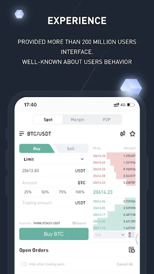This cryptocurrency trading app urges users to create personalized profiles for a safe experience. Users can go through KYC verification, Real Name verification and Advanced verification to become legitimate members.