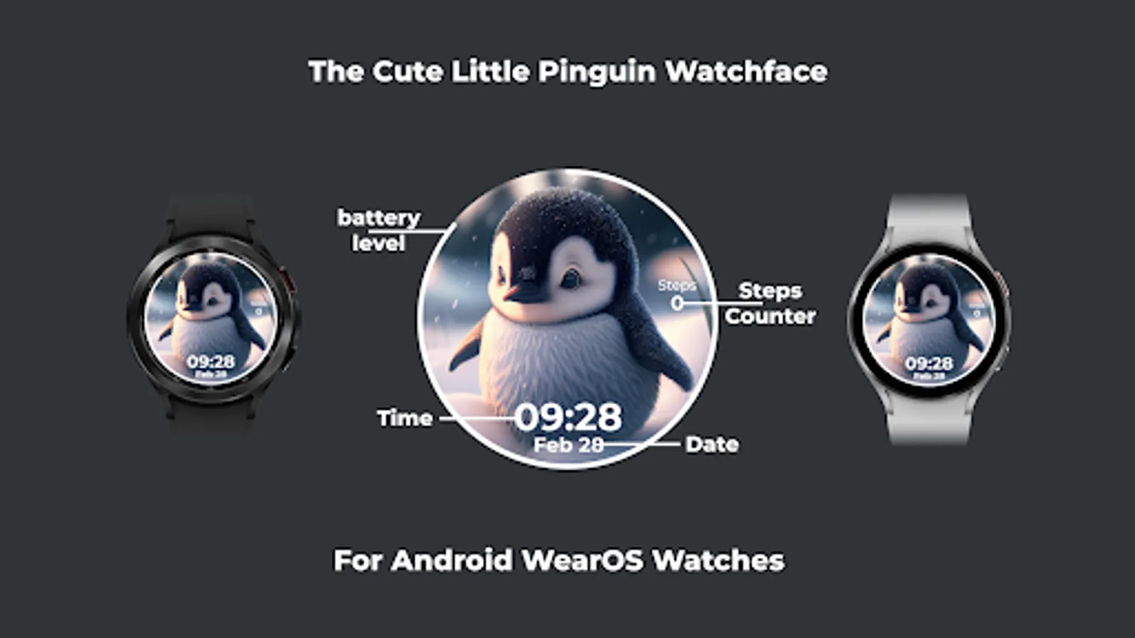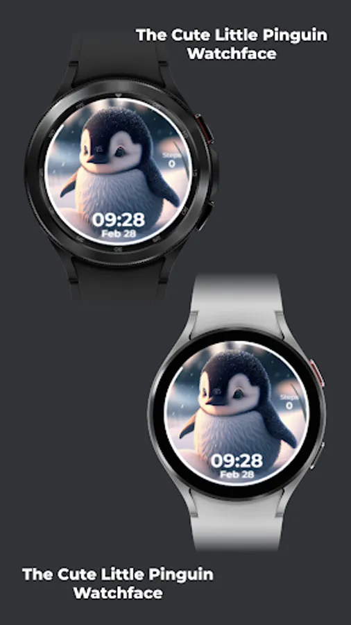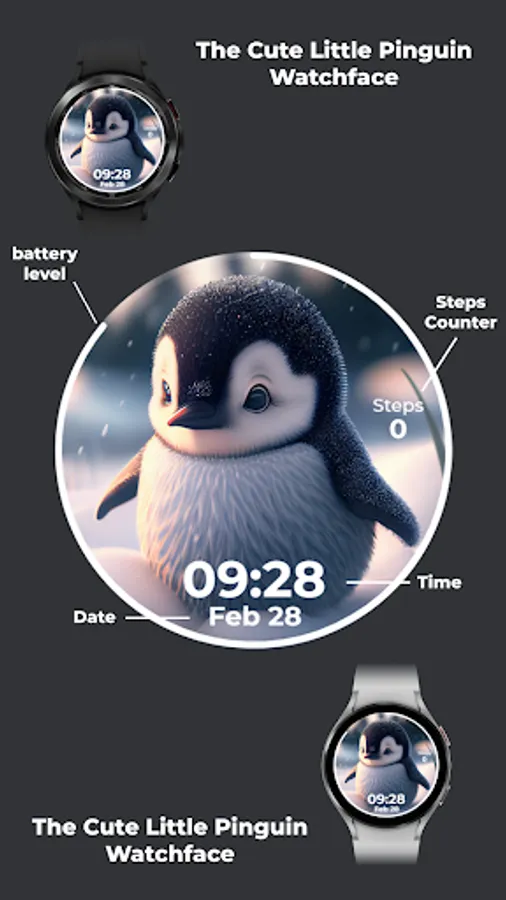 Simple and Cute Ai Created Pinguin Watchface featuring a steps counter, a ring battery level indicator, 24H Time Display. Day and Date of the month.