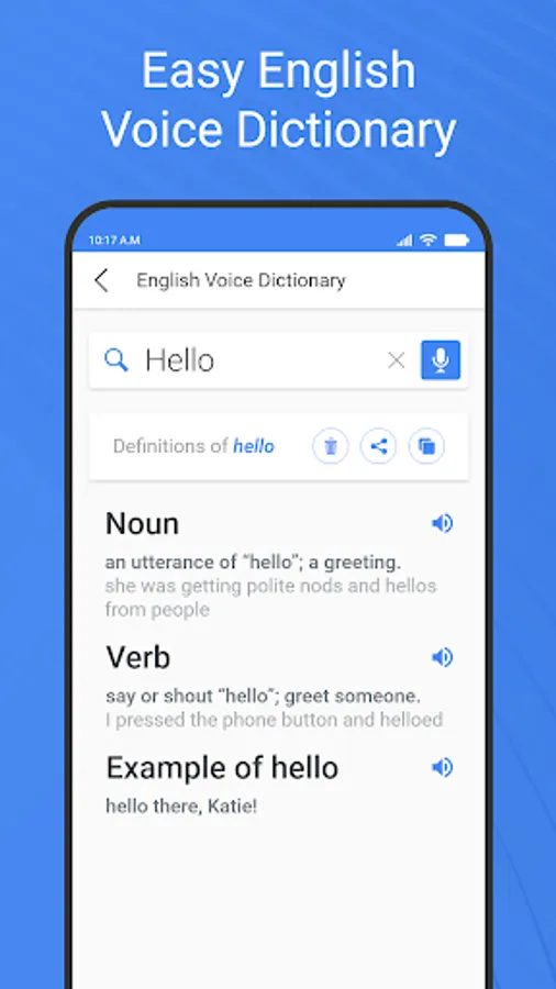 Search any word in English voice dictionary by speaking in mic to get the meaning, definition and synonym of a particular word. You can further copy, share the results with friends.