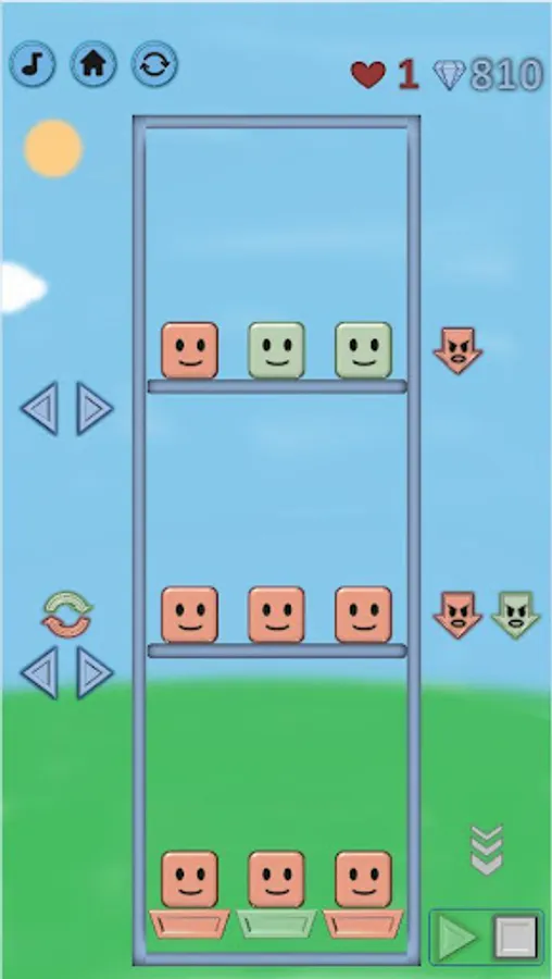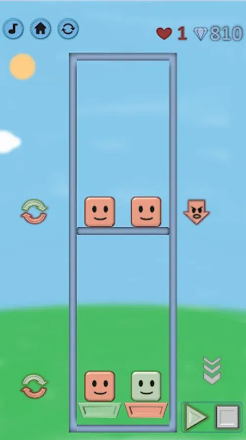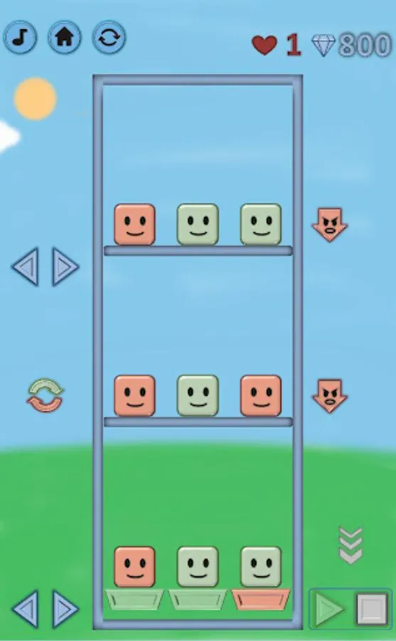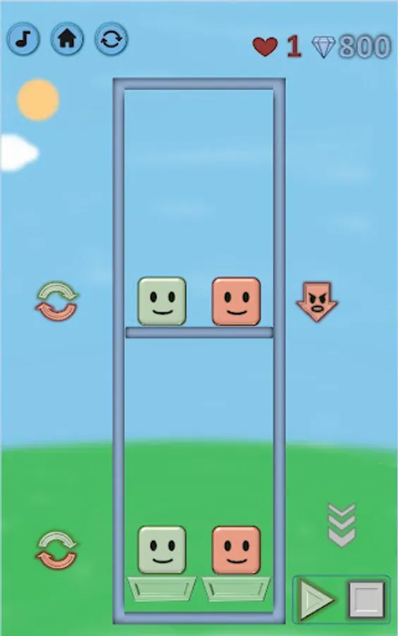Hooha are creatures that look like squares. They are either red or green, as sometimes they can switch color. Hooha live on an unknown island. In their spare time, they love to play a game, in which they jump off high-rise and drop onto others that stay on the lower floors. Sometimes they get so angry and smash others but sometimes they are smashed. The goal of the game is to drop all to the bottom and make the colors of remaining Hooha as desired.