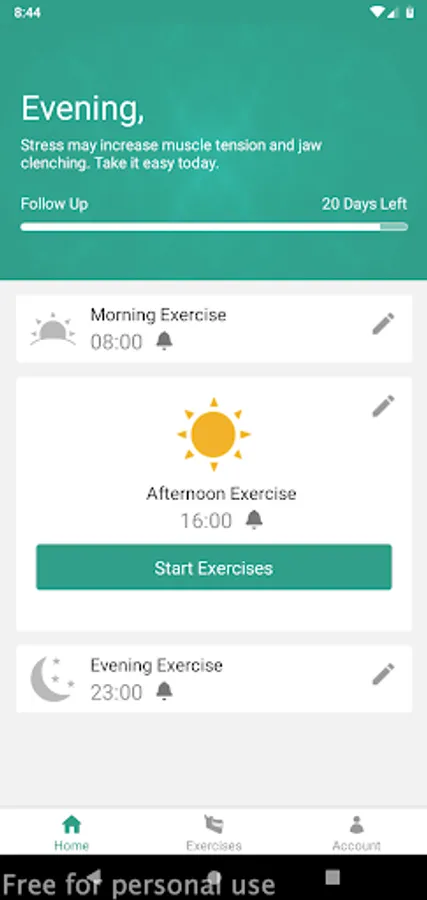 The Eaze app supports the patients to increase their commitment and cooperation treatment by customized exercises given by specialist doctors for TMD. The app will give access to customized exercise programs, daily reminders, animated instructions, and follow-up survey. Patients will have access to customized exercises that could relieve their pain, give general advice and tips to reduce pain, and be able to ger reminders and more information on exercise benefits. The patients are able to rate their pain levels on weekly basis by a standard scale for pain levels.
