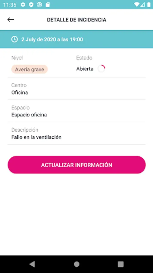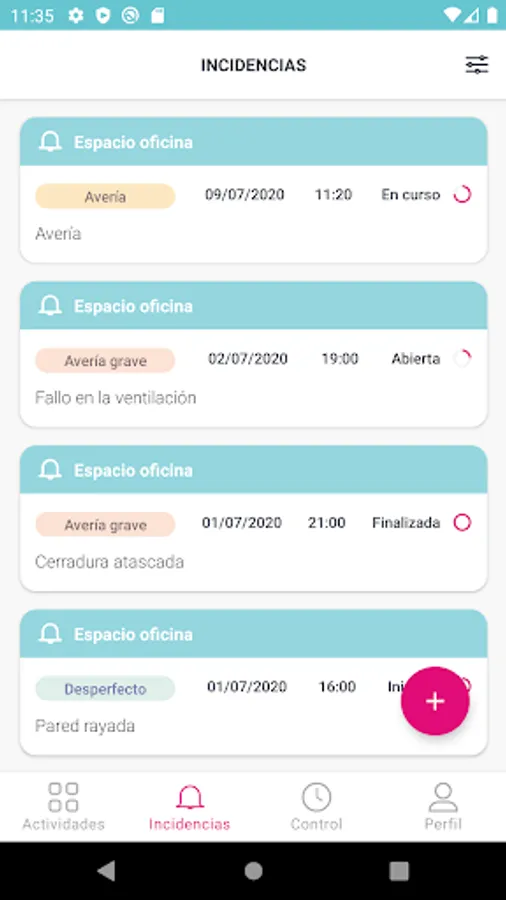 Open and manage incidents and breakdowns that arise in the installation easily from the same application. They can be classified by level of importance and allow the notification to the coordination by means of a pop-up message.