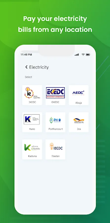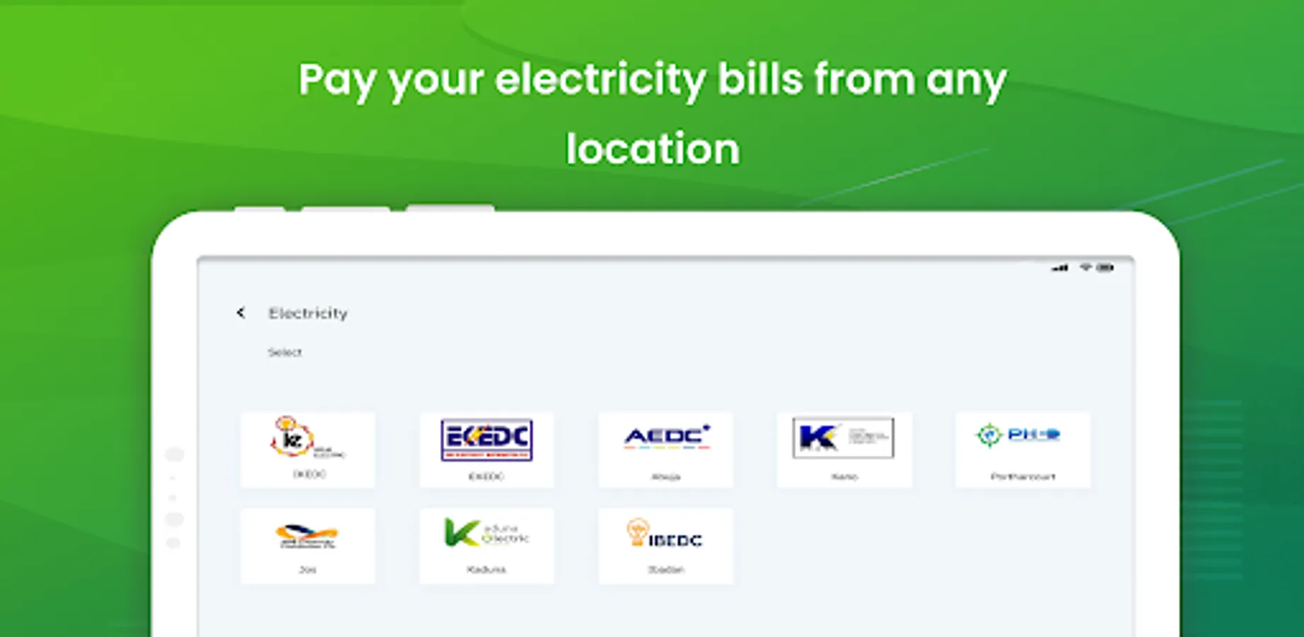 Make electricity bill payments across Nigeria from various service providers such as EKEDC, Eko Electric, AEDC, etc