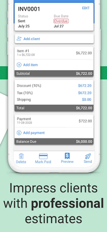Easy Invoice makes it easy to create and send invoices. All your data is automatically totalled and formatted into a professional estimate or invoice template. Even better, you can do all this from your phone, on-the-go or at the job site!