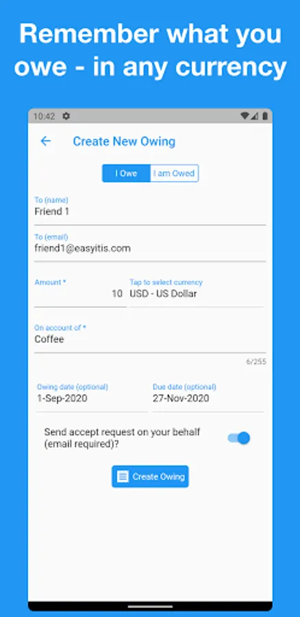 Don't lose friends because you forgot to pay them back! And don't lose money because you are too shy to ask your friends to return money to you. Use Owingly!