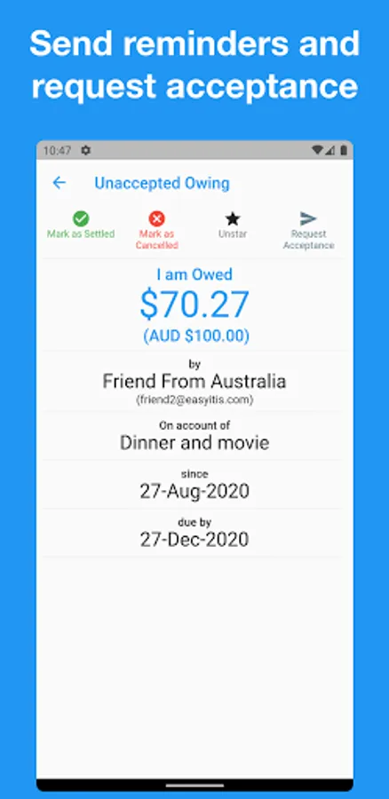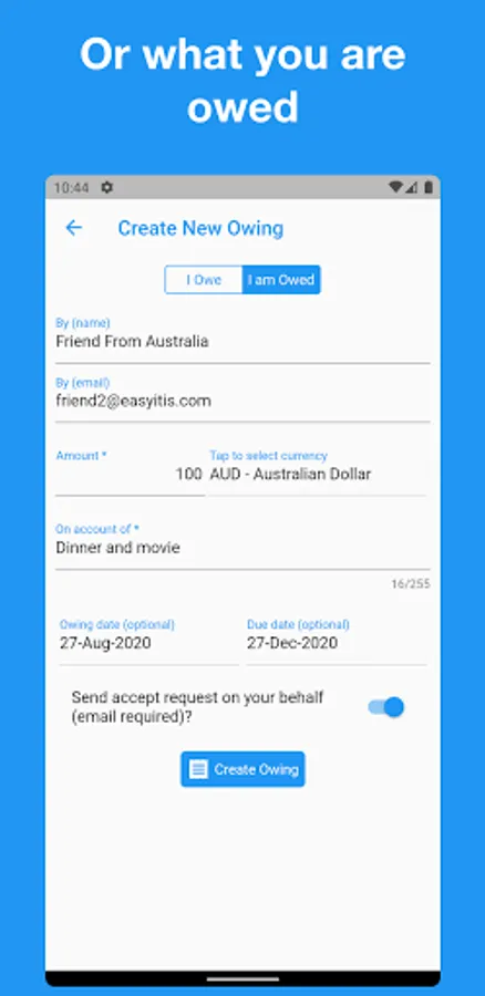 Owingly can inform you when someone creates an Owing for you. Also, it can help you send acceptance requests and reminders#.