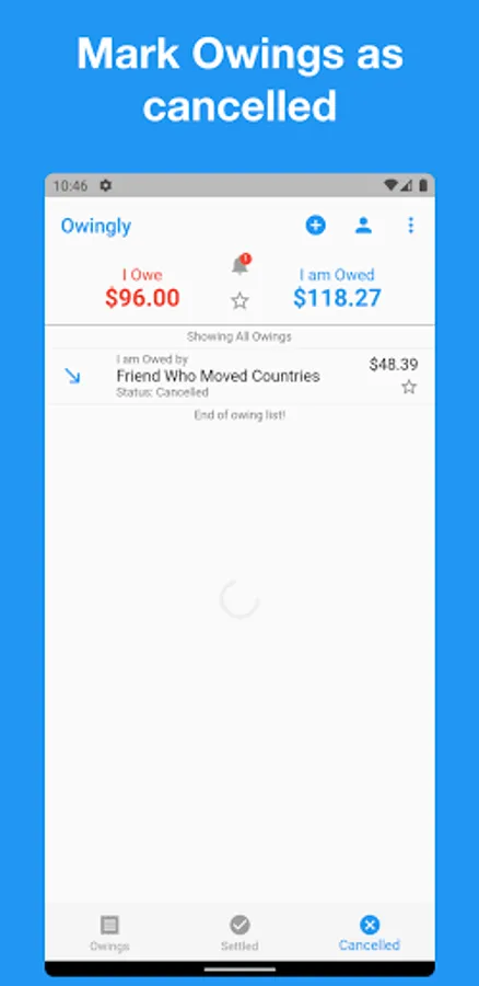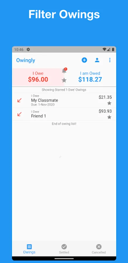 Owingly helps you keep track of all your owings - what you owe and what is owed to you.