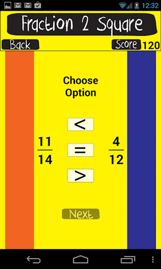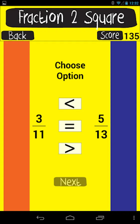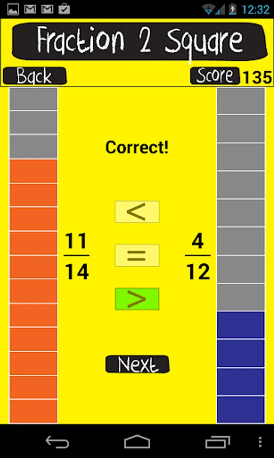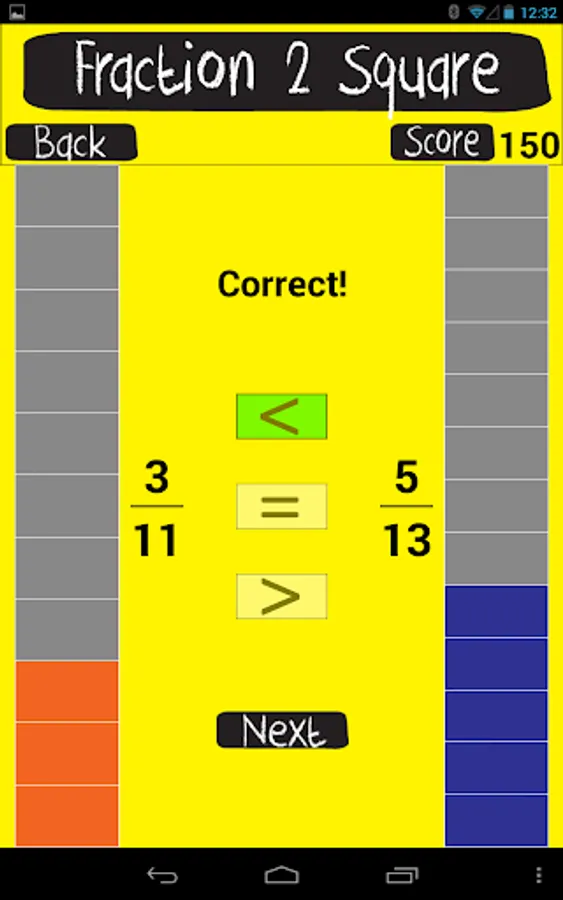 How to Play - Compare the two fractions shown on the screen and choose between less than / equal / greater than. The correct answer shows in green with a visual explanation of how the fractions compare. Correct answer is worth +5 points and incorrect answer is worth -5 points. Get 8 correct answers in a row to get to the next level.