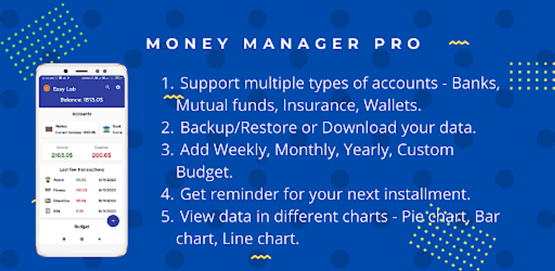- Money manager pro provides support to various types accounts of bank(current account, savings account, recurring deposit, fix deposit), mutual funds(SIP, one time), Insurance(life time, fix time).
