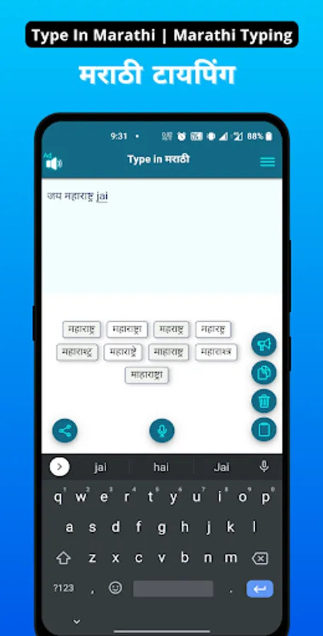 Copy the typed Marathi text and use it anywhere on emails, chat, facebook, watsapp, twitter or anywhere you want. If you want to type "जय महाराष्ट्र" then simply type "Jai maharashtra", Type In Marathi (Marathi typing) app will automatically convert it in Marathi language.