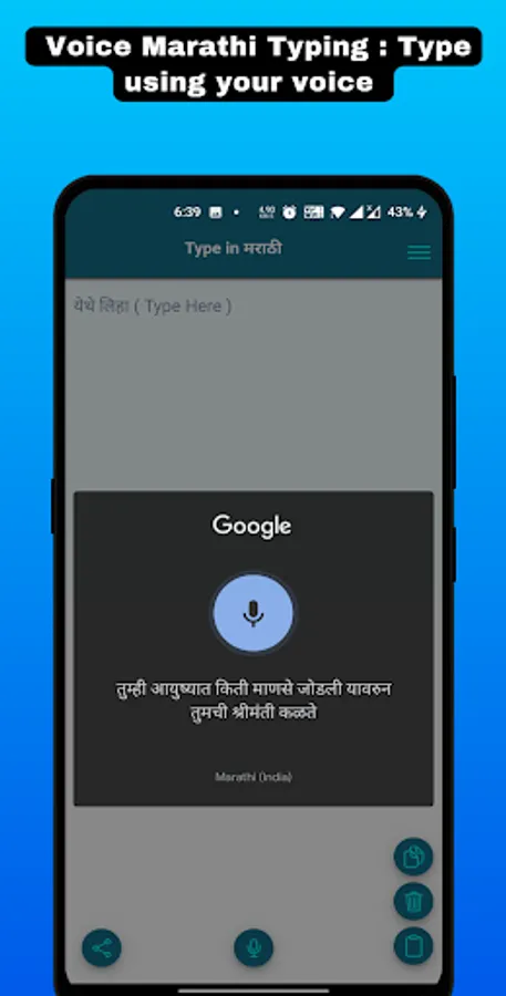 - App contains android's inbuild voice translator feature to make it look like translator AI (Artificial Intelligence) which will convert your voice into marathi text. Using this voice marathi typing feature you can type as many as words, paragraphs, stories or notes in marathi without using keypad. just simply speak in marathi using mic icon and it will add those spoken word into text. After that you can use this text to share on any social media platfrom which is in marathi.