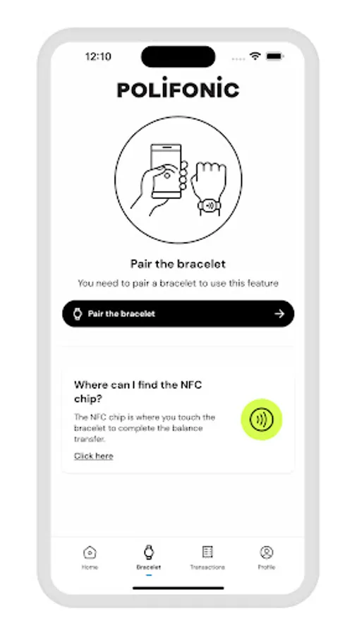 Download the application, load the balance of your wallet and transfer the balance to your bracelet.