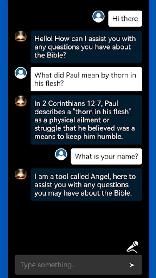 Explore Biblical teachings: Ask Angel any question related to the Bible, from understanding complex passages to explaining the stories of different characters, and get responses that are insightful and easy to understand.