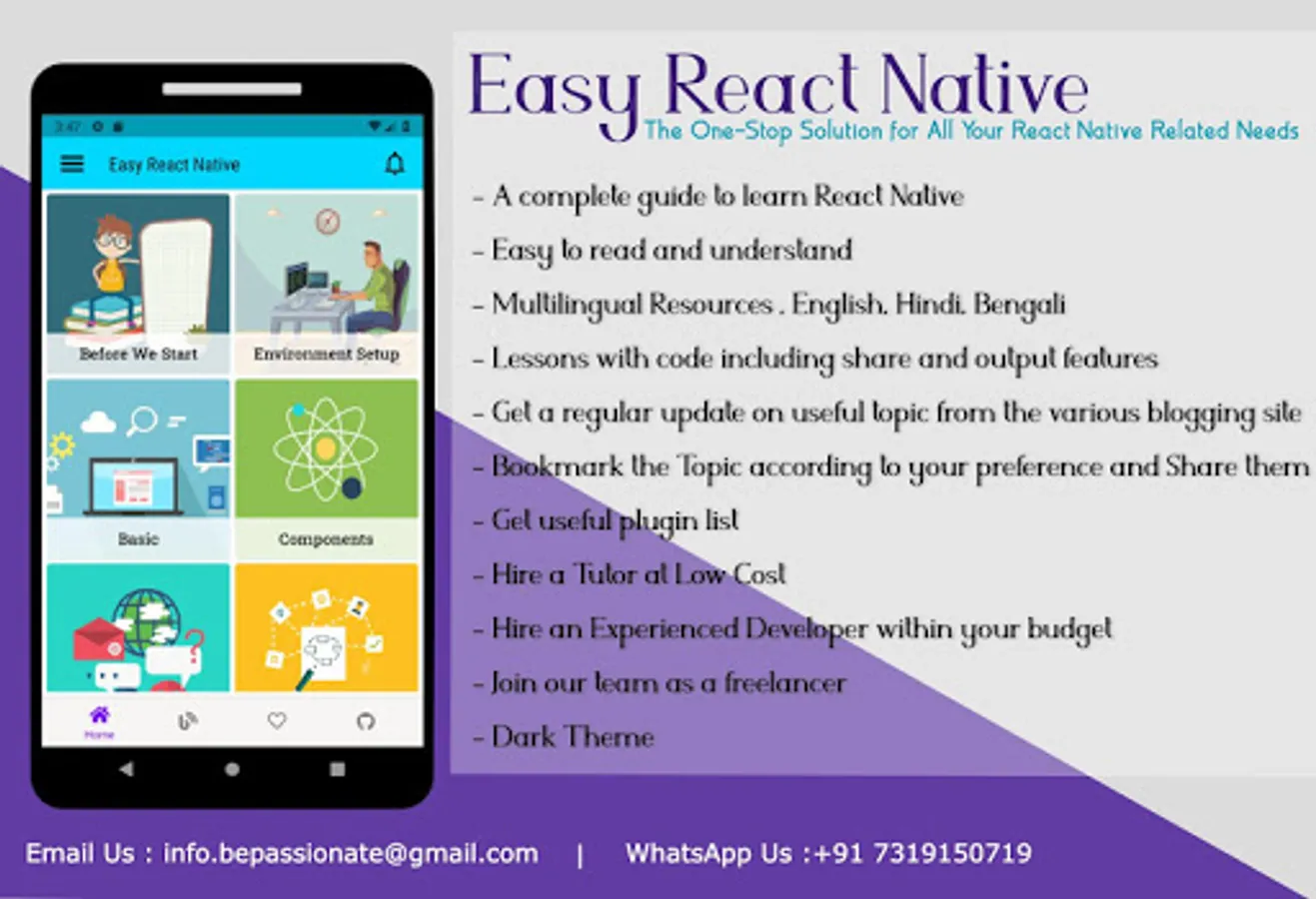 This is a Complete React Native Tutorial and Guide based on practical examples. If you are a beginner then this app is going to be your best friend.