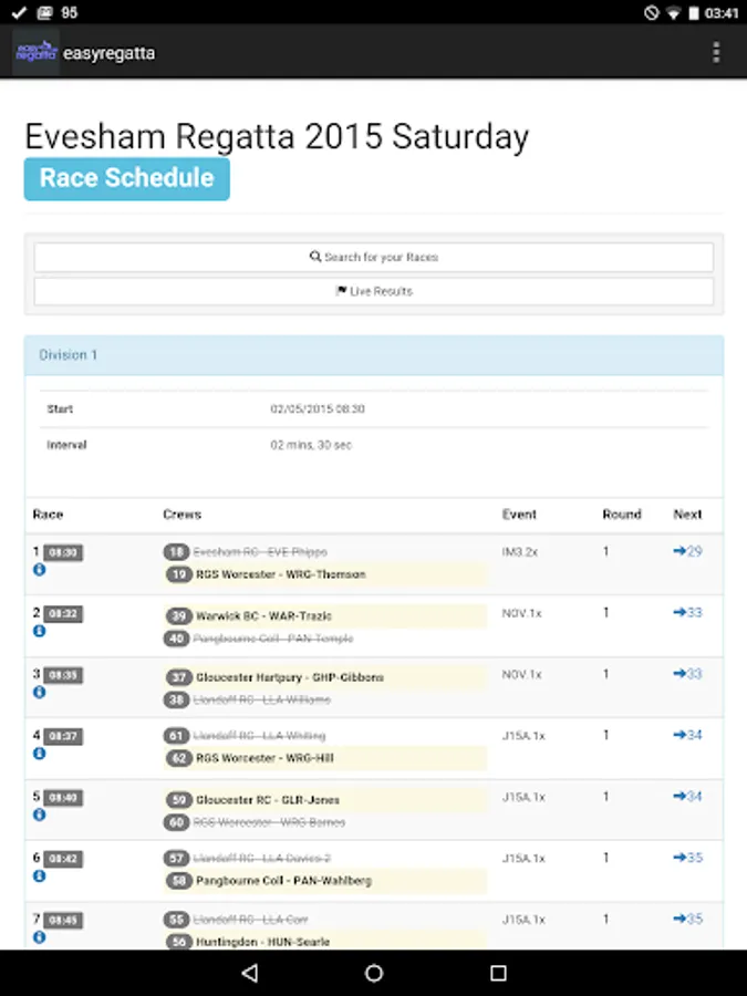The easyregatta android app allows you to check race times and schedules of competitions run by clubs using easyregatta . It also gives you access to view live results as soon as they are published online.