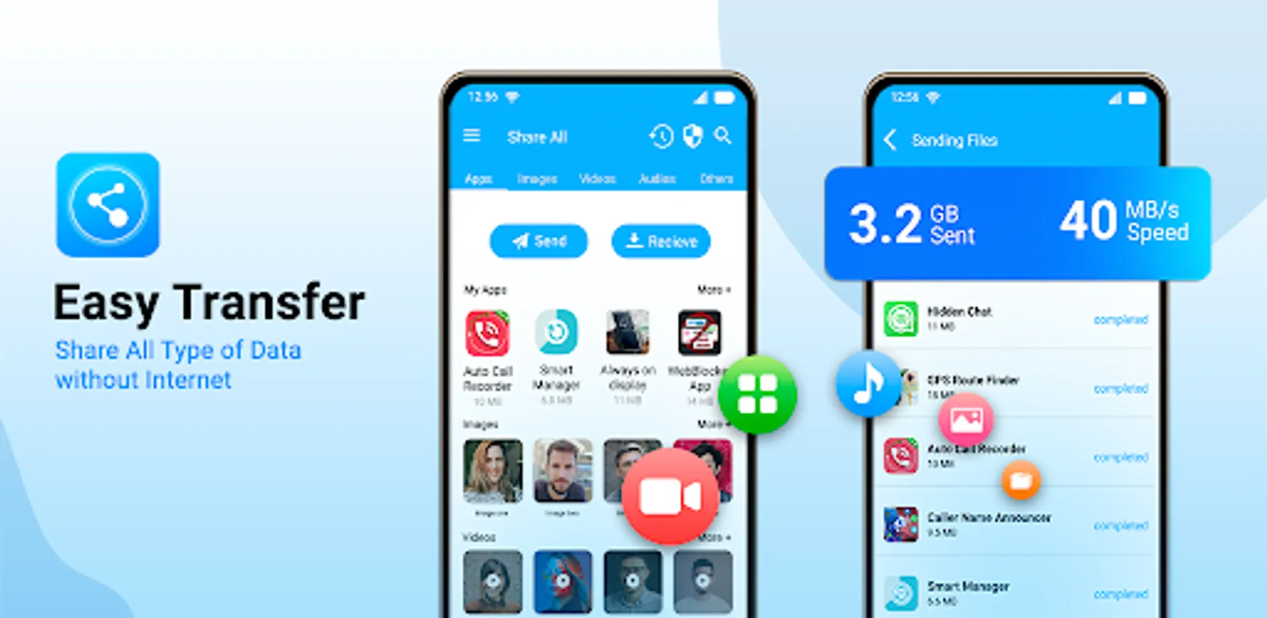Shareall is quick and easy file transfer app which transfer data from one phone to another in two easy steps, without internet or Mobile Data.