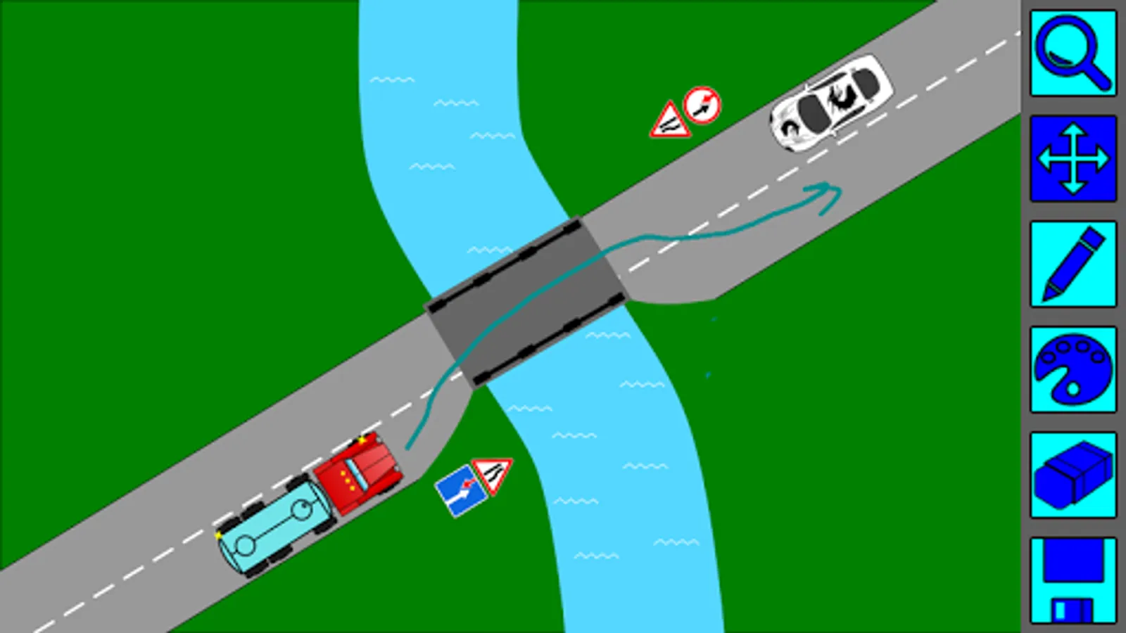 Using the drawing tools, you can show the trajectory of movement of vehicles, show overtaking, advancing, oncoming traffic, explain the rules to stop and parking rules roundabouts.