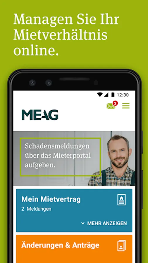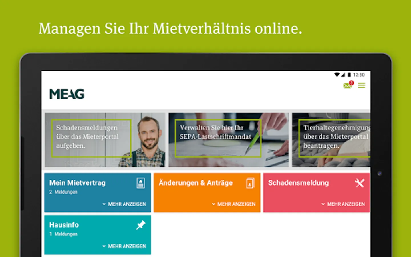 My home with the MEAG tenant app. A platform with many service functions around your MEAG tenancy. With this app, you as a tenant of MEAG can contact us quickly and easily on many important topics.