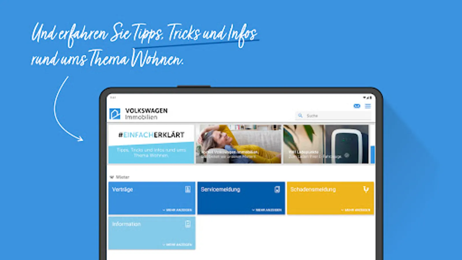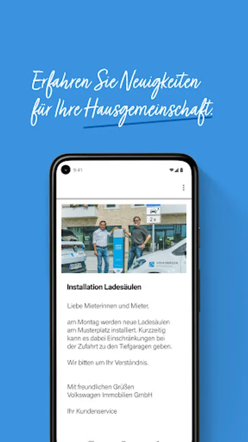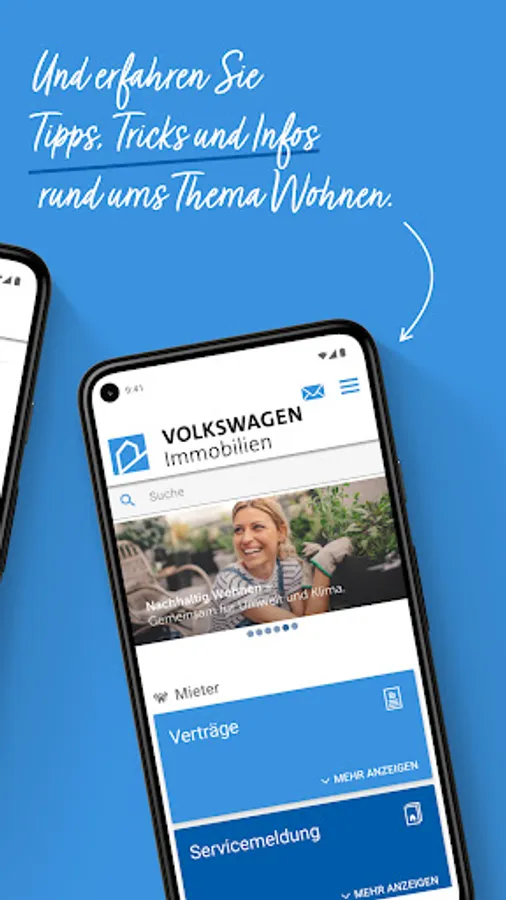 Are you a tenant at Volkswagen Immobilien and would you like to enjoy numerous benefits from now on? Then download the free “My VWI” app now! With this app you have direct access to your rental agreement and your utility bills. In addition, you benefit from many advantages and services, such as the simple and uncomplicated reporting of damage or the submission of additional applications relevant to the rental agreement. In addition, you will receive important information that only affects your household directly on your smartphone. Don't miss any more news and optimize your living comfort with the "My VWI" app - download it now!