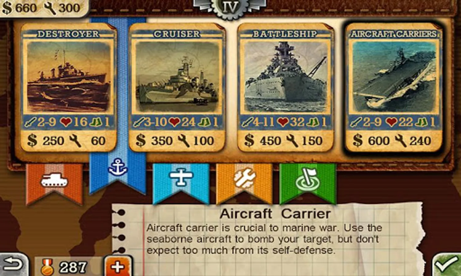 The army can use various supporting tactics including entrenchments, radars, land forts and anti-aircraft guns for more defenses. The navy may get effective marine strength through combination of destroyers, cruisers, battleships and aircraft carriers. Air strikes, strategic bombing, airborne forces or devastating nuclear bombs help the air force to destroy hostile defense lines.