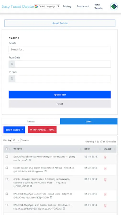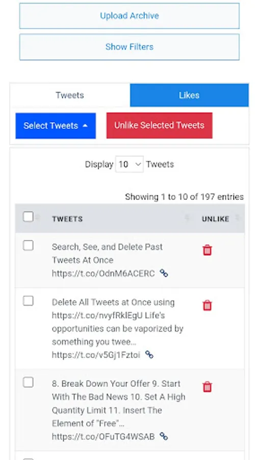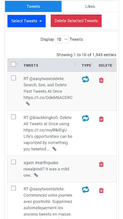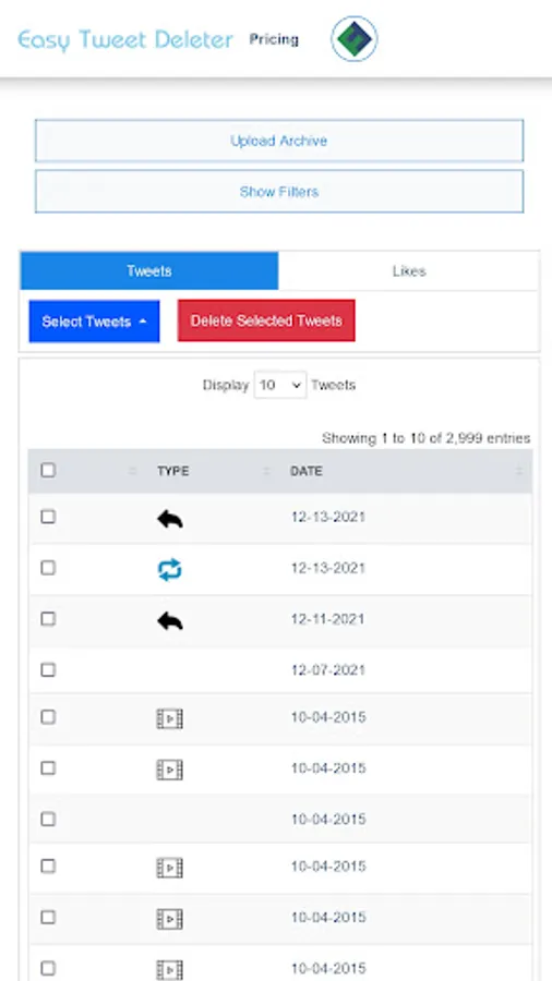Use the Easy Tweet Deleter application to bulk delete all your tweets. After signing into the Easy Tweet Deleter application, it will automatically showcase the recent tweets below the Tweets section. If you only want to see the Likes, click on the Likes tab. After viewing your tweets, you can delete selected or all of the tweets at once. You can search your old posts using filters such as keyword, date, and post-type.